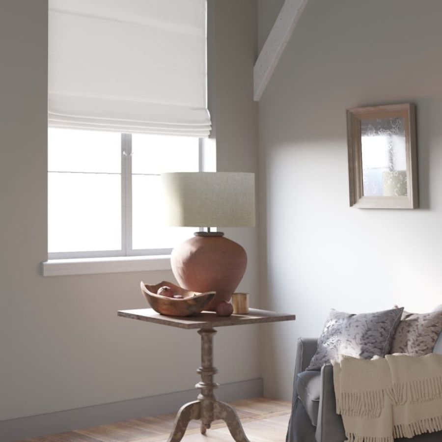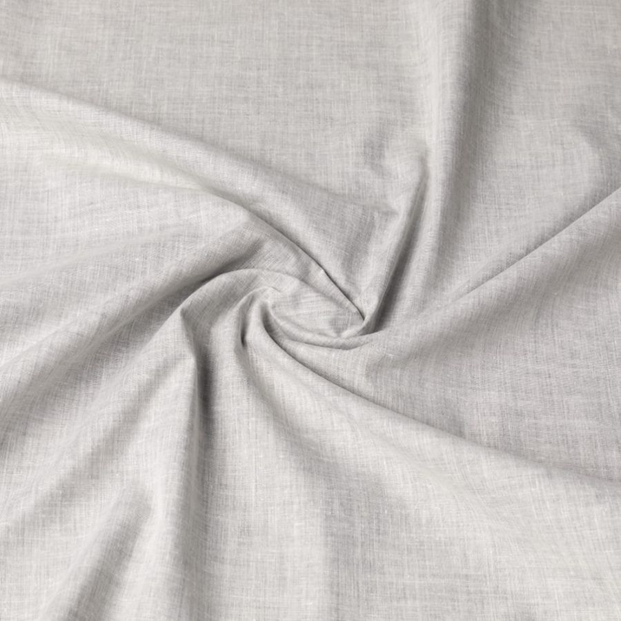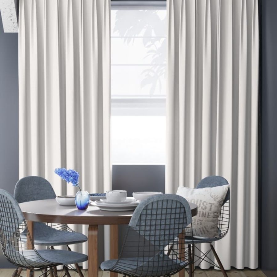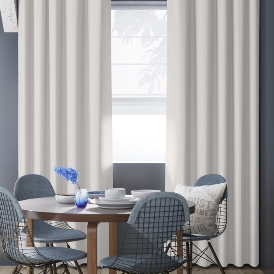 Stevige zeer verduisterende gordijnstof. De voorzijde is mat ecru voorzien van een zacht aanvoelende coatinglaag, de achterzijde van de stof is grijs gemêleerd. Niet toepasbaar als soepel vallende stof, maar als nonchalant, royaal hangend gordijn.