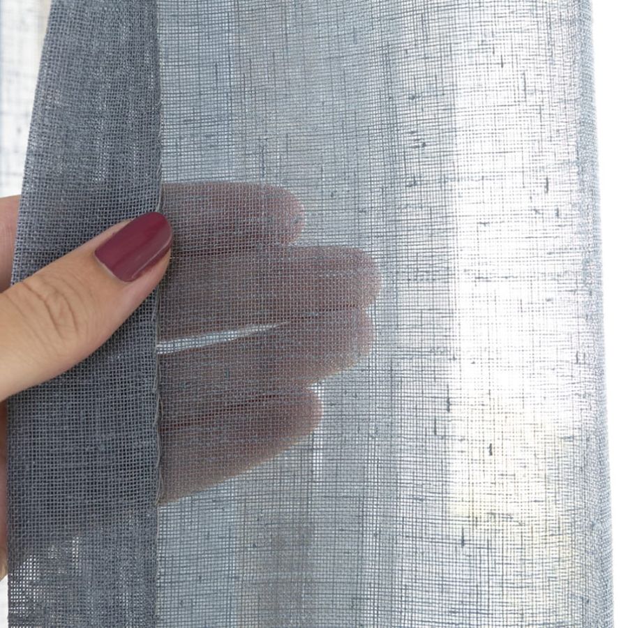 Open geweven vitrage met een natuurlijk ogende linnenlook. De stof is kamerhoog zodat in de confectie geen naden zichtbaar zullen zijn. Aan de onderzijde van de stof is een verzwaringskoord gemaakt, zodat deze prachtig valt en er geen zoom in hoeft.
