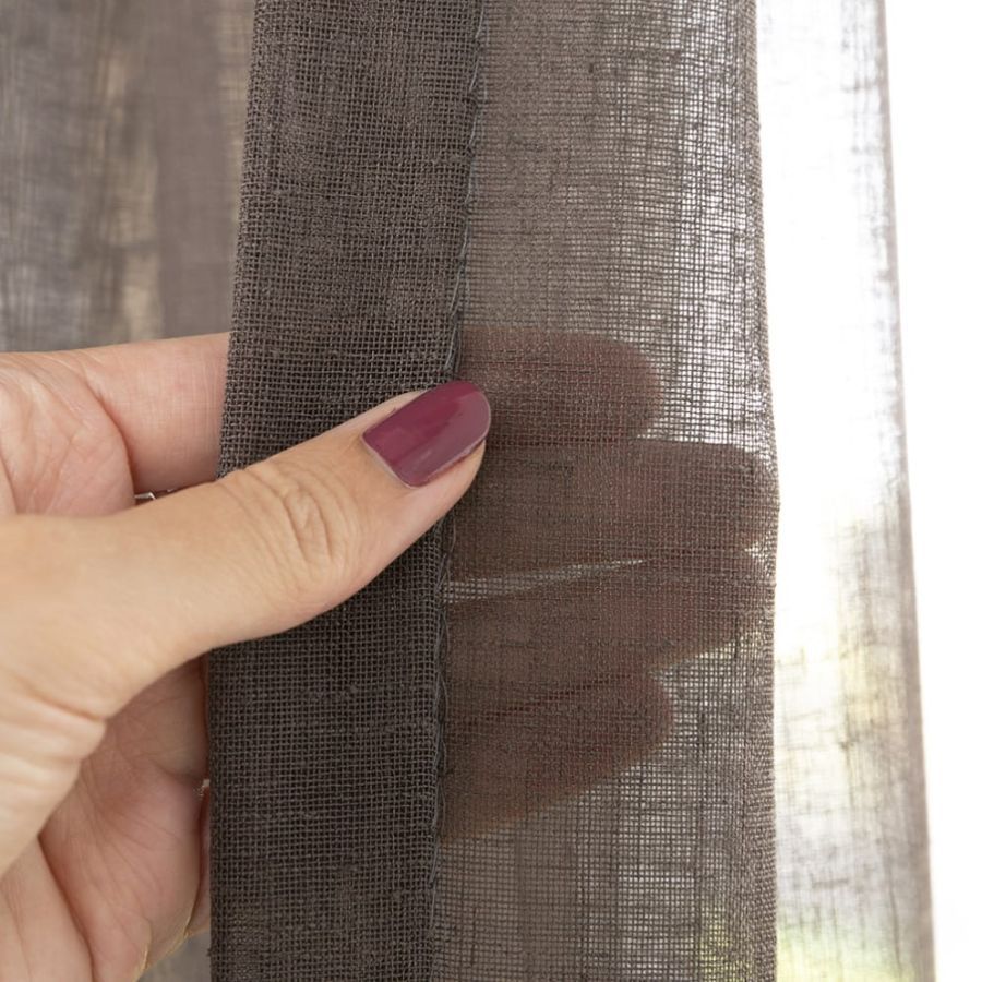 Open geweven vitrage met een natuurlijk ogende linnenlook. De stof is kamerhoog zodat in de confectie geen naden zichtbaar zullen zijn. Aan de onderzijde van de stof is een verzwaringskoord gemaakt, zodat deze prachtig valt en er geen zoom in hoeft.