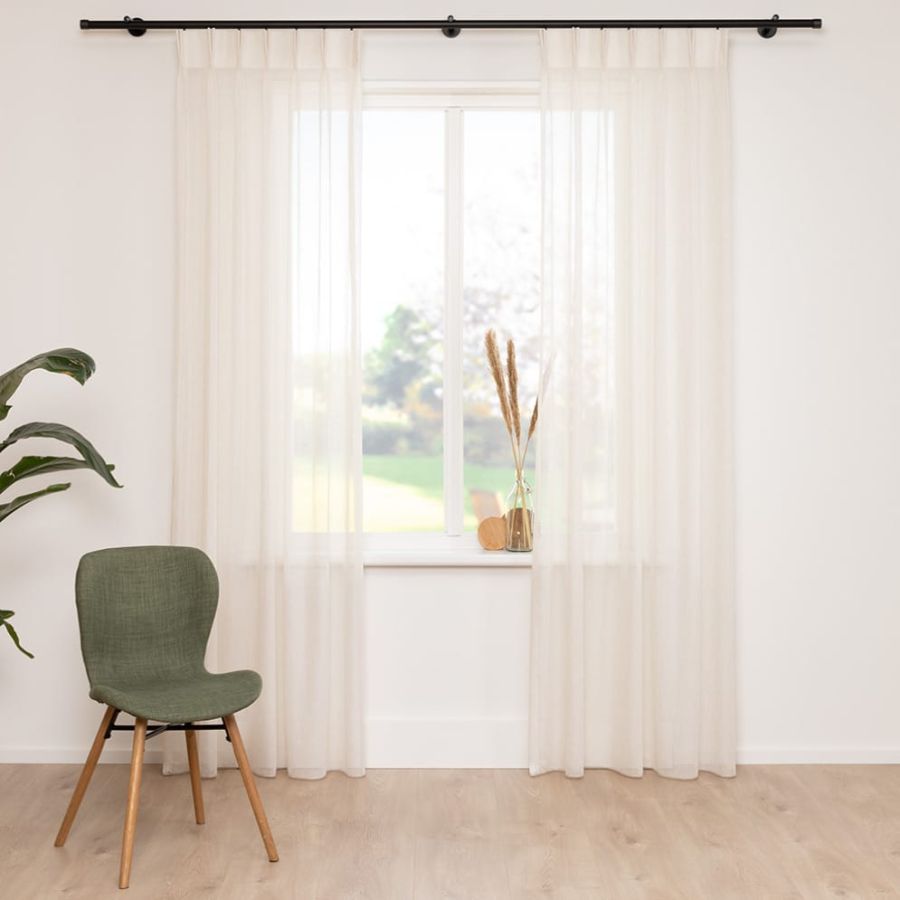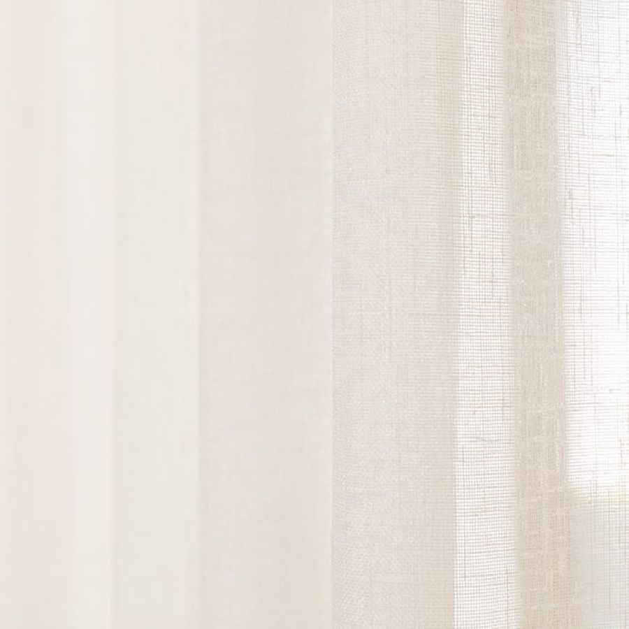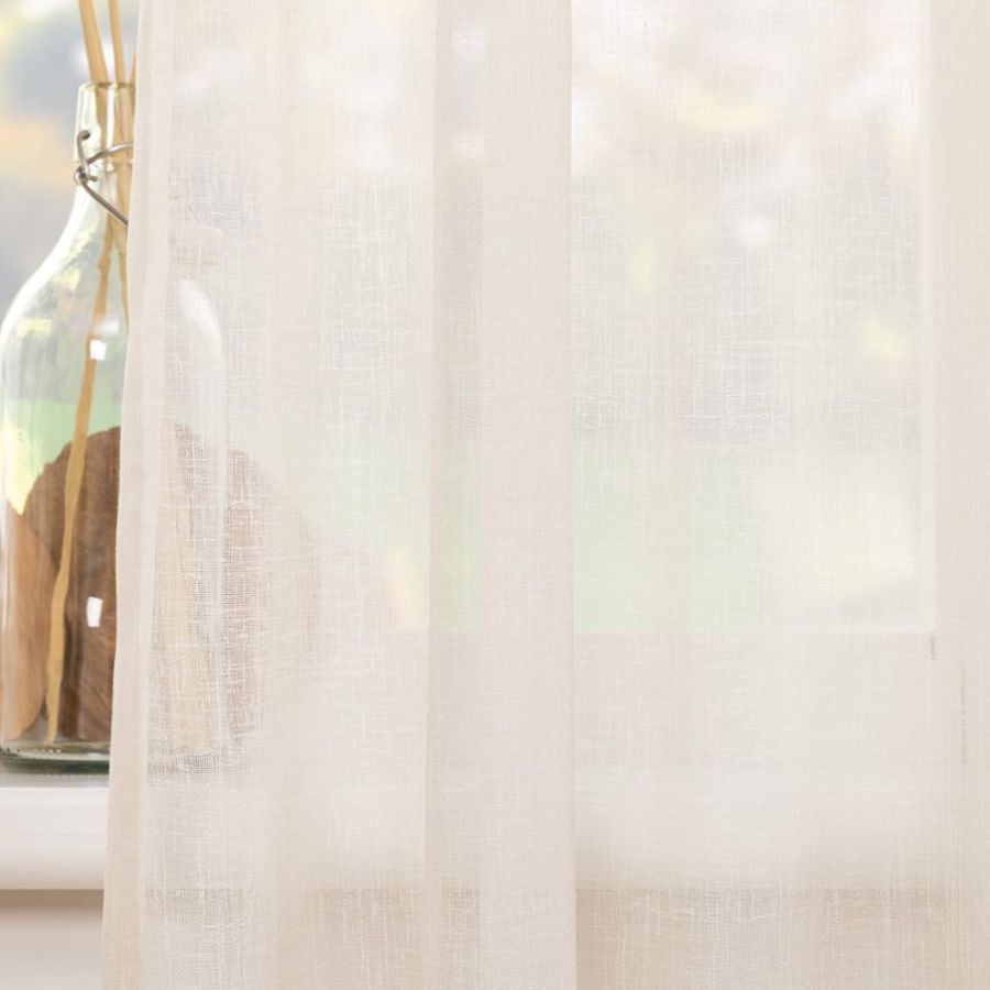 Open geweven vitrage met een natuurlijk ogende linnenlook. De stof is kamerhoog zodat in de confectie geen naden zichtbaar zullen zijn. Aan de onderzijde van de stof is een verzwaringskoord gemaakt, zodat deze prachtig valt en er geen zoom in hoeft.