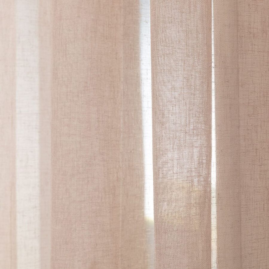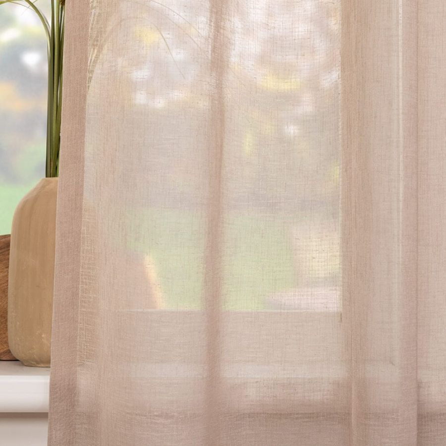 Open geweven vitrage met een natuurlijk ogende linnenlook. De stof is kamerhoog zodat in de confectie geen naden zichtbaar zullen zijn. Aan de onderzijde van de stof is een verzwaringskoord gemaakt, zodat deze prachtig valt en er geen zoom in hoeft.